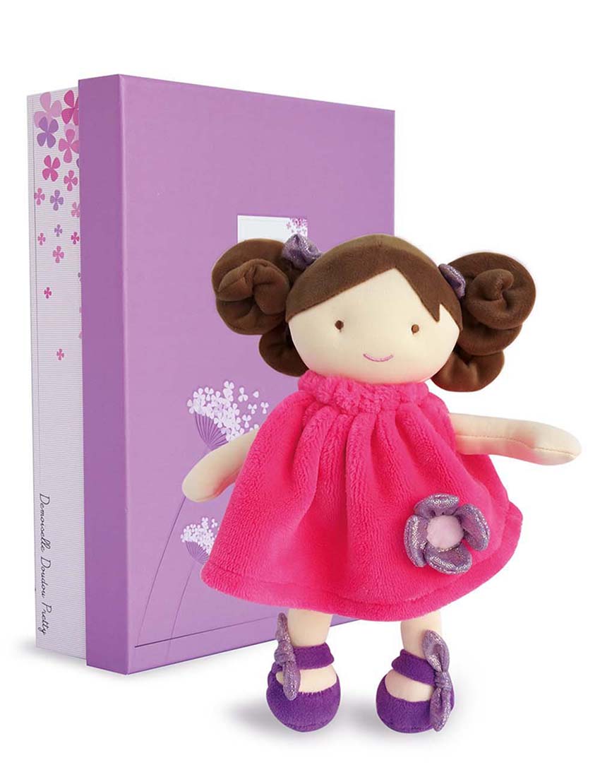 This soft doll is an adorable brunette girl with a simple a-line dress and Mary Jane shoes. Notice the bows on her shoes and hair! Her hair features pigtails with crinkly 'curled' hair. Adorable and soft, these girls will be every child's first best friend.