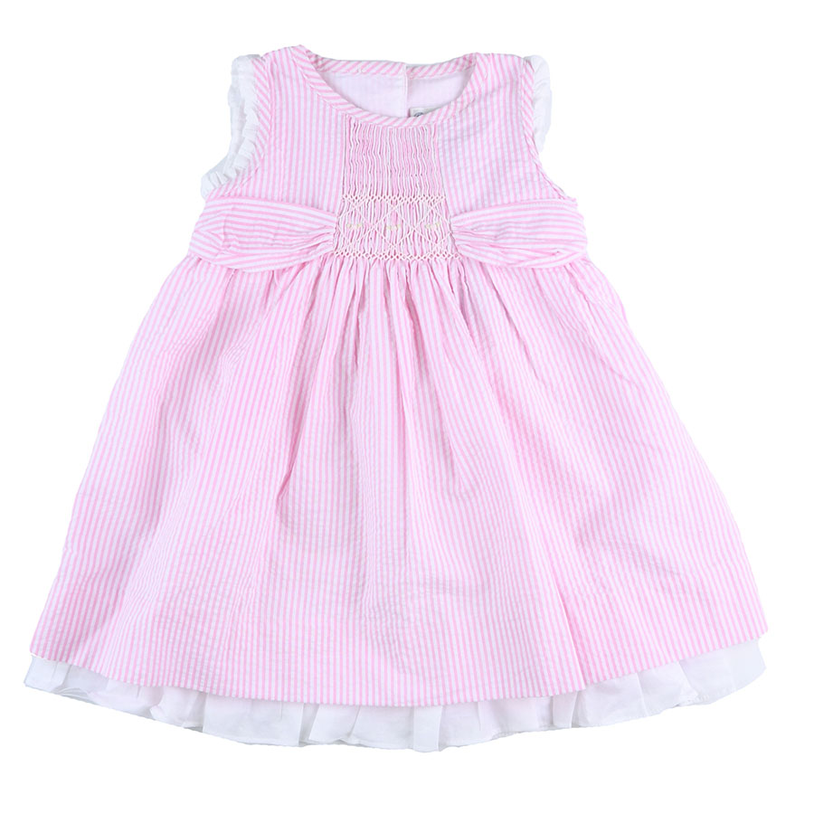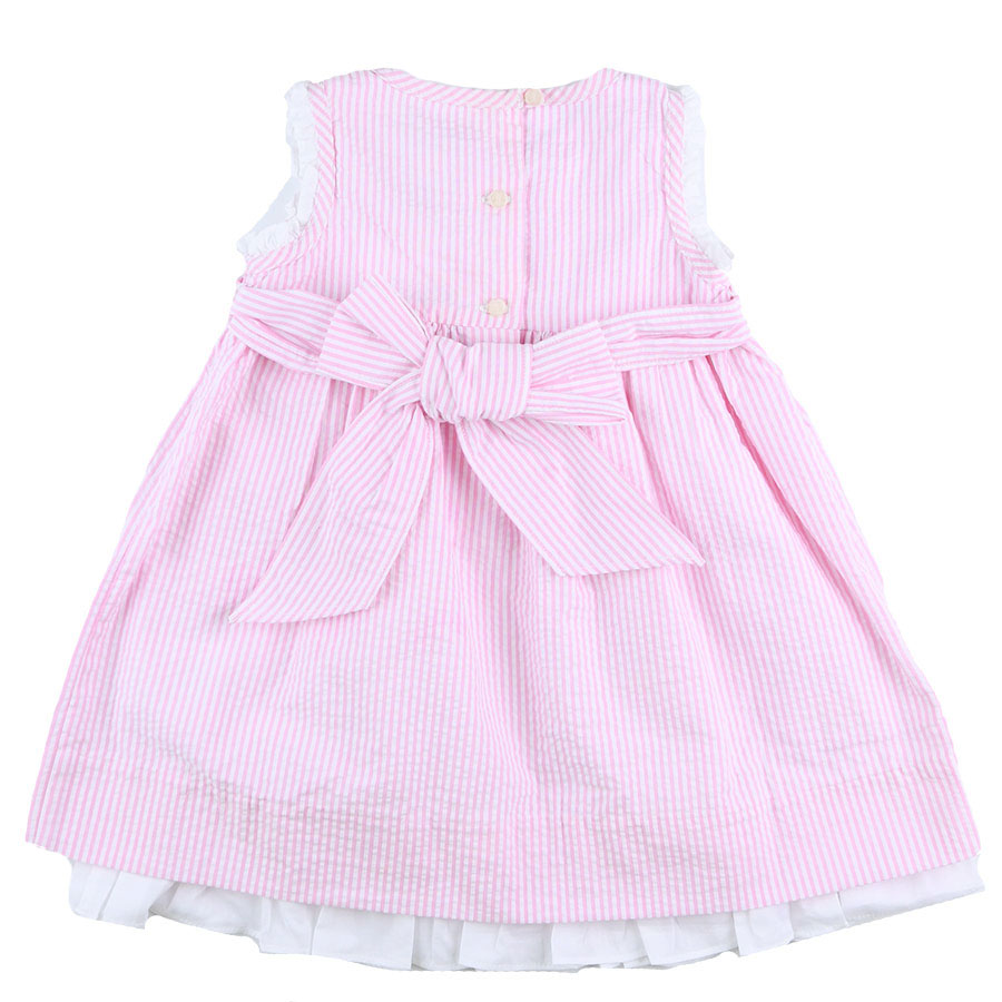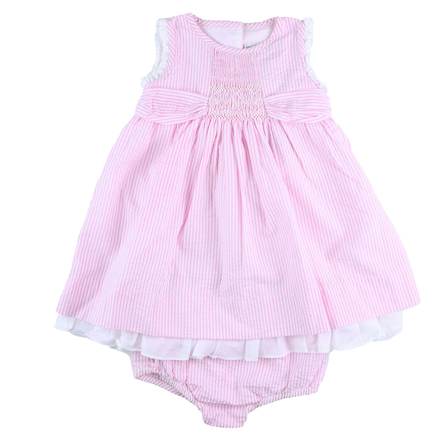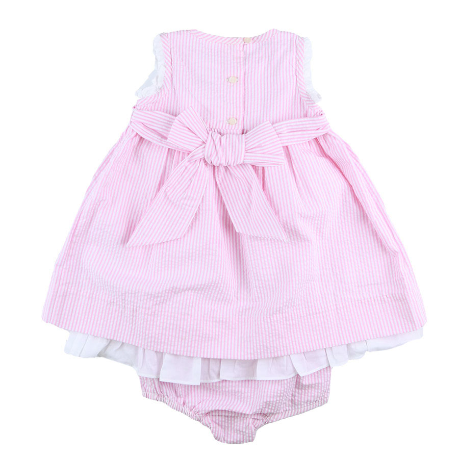 Truly adorable little dress. Fairytale look with thin white and pink stripes (known as candy stripes) and a cute bow at the back. Comes with additional baby bottom piece.